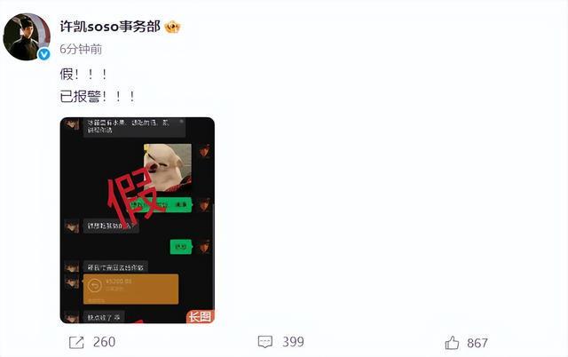 8月22日,许凯工作室打假网传聊天记录,称:“假!!!已报警!!!”