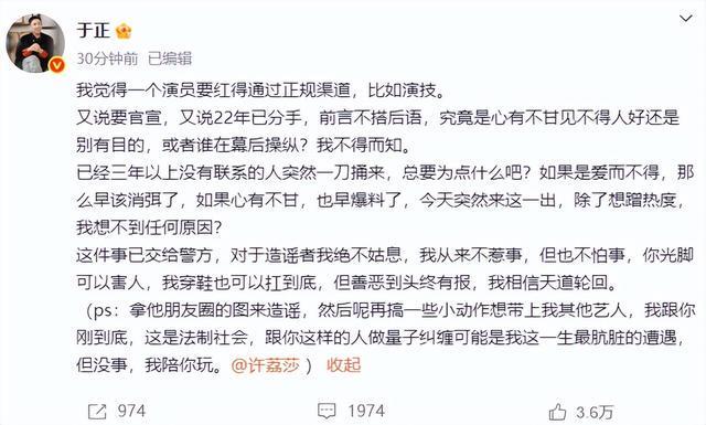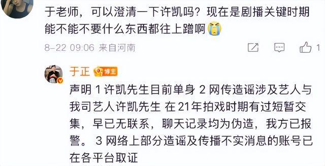 许凯老板于正也在社媒评论区,回应许凯恋情话题,称许凯目前单身,其与网传造谣涉及艺人在21年拍戏时有过短暂交集,早已无联系,聊天记录均为伪造,已报警。