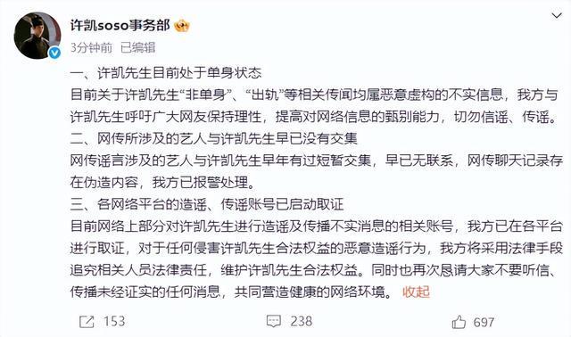 目前关于许凯先生“非单身”、“出轨”等相关传闻均属恶意虚构的不实信息,我方与许凯先生呼吁广大网友保持理性,提高对网络信息的甄别能力,切勿信谣、传谣。