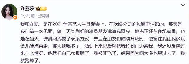 我和许凯,是在2021年某艺人生日聚会上,在欢娱公司的包厢里认识的,那天是我们第一次见面。第二天某剧组的演员朋友邀请我聚会,地点正好在许凯家里。也是在当天,许凯问我要了联系方式,并且在朋友们陆续离场时,他留住我让我多玩会儿晚点再走。那天他喝多了,酒劲上来以后就把我拉到门边亲我,我还没反应过来什么情况,他就把自己衣服脱了,我被吓飞了,结果因为喝太多他晕过去了,我就跑掉了。